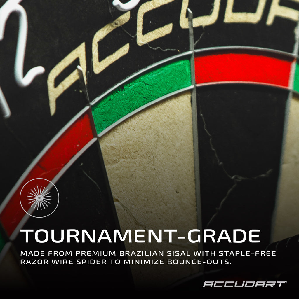 - TOURNAMENT-GRADE DARTBOARD - Made from premium Brazilian sisal with a staple-free razor wire spider to minimize bounce-outs.