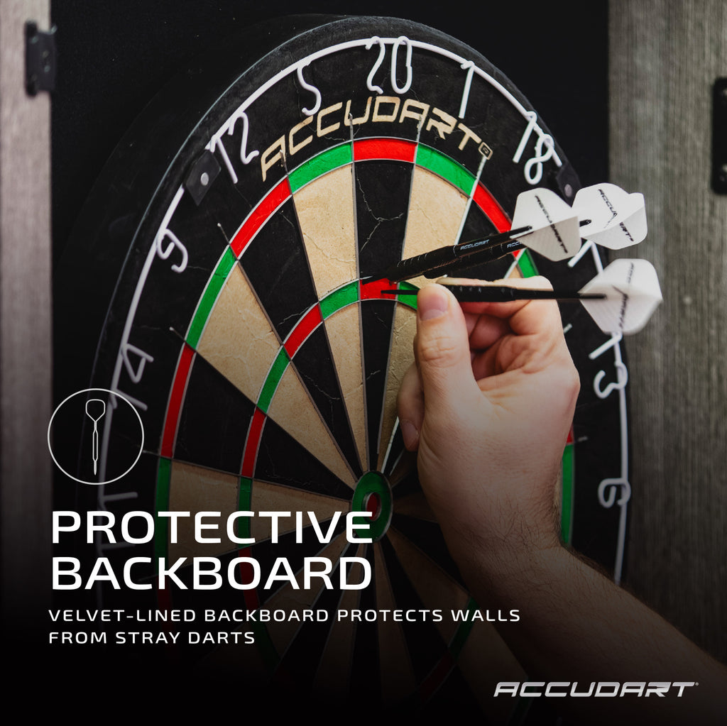 - PROTECTIVE BACKBOARD - Velvet-lined backboard protects walls from stray darts, plus dual chalkboards with chalk and eraser for scorekeeping.