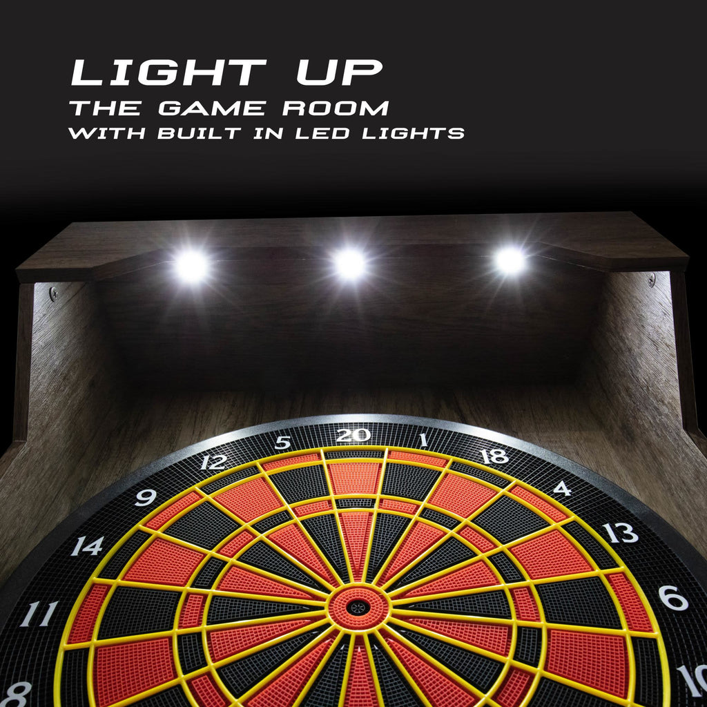 - LED STANDING DARTBOARD CABINET – Upgrade your dart setup with this freestanding dartboard cabinet in a rustic tan wood grain finish, featuring built-in LED lighting for tournament-style play, three spacious shelves for storage and display, and a dedicated compartment to organize your darts, tips, and flights—perfect for competitive matches, casual fun, and game room décor. Assembled Dimensions: 20.47" x 11.02" x 82.68"