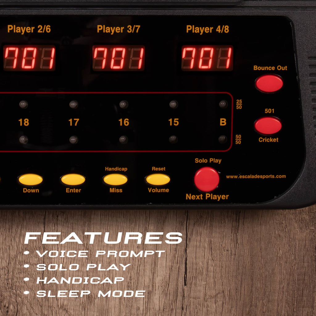 - 8-PLAYER LED SCORE DISPLAY WITH TRI-COLOR CRICKET – Supports up to 8 players with an easy-to-read LED scoring panel. Cricket mode features a tri-color scoring bulb system: green for 1 hit, orange for 2 hits, and red for a closed number—perfect for fast-paced multiplayer matchups.