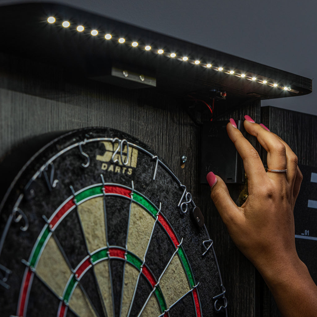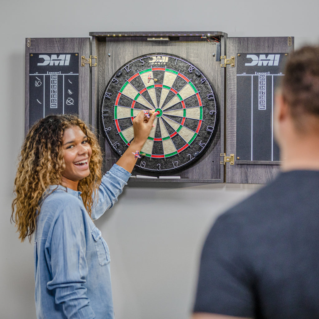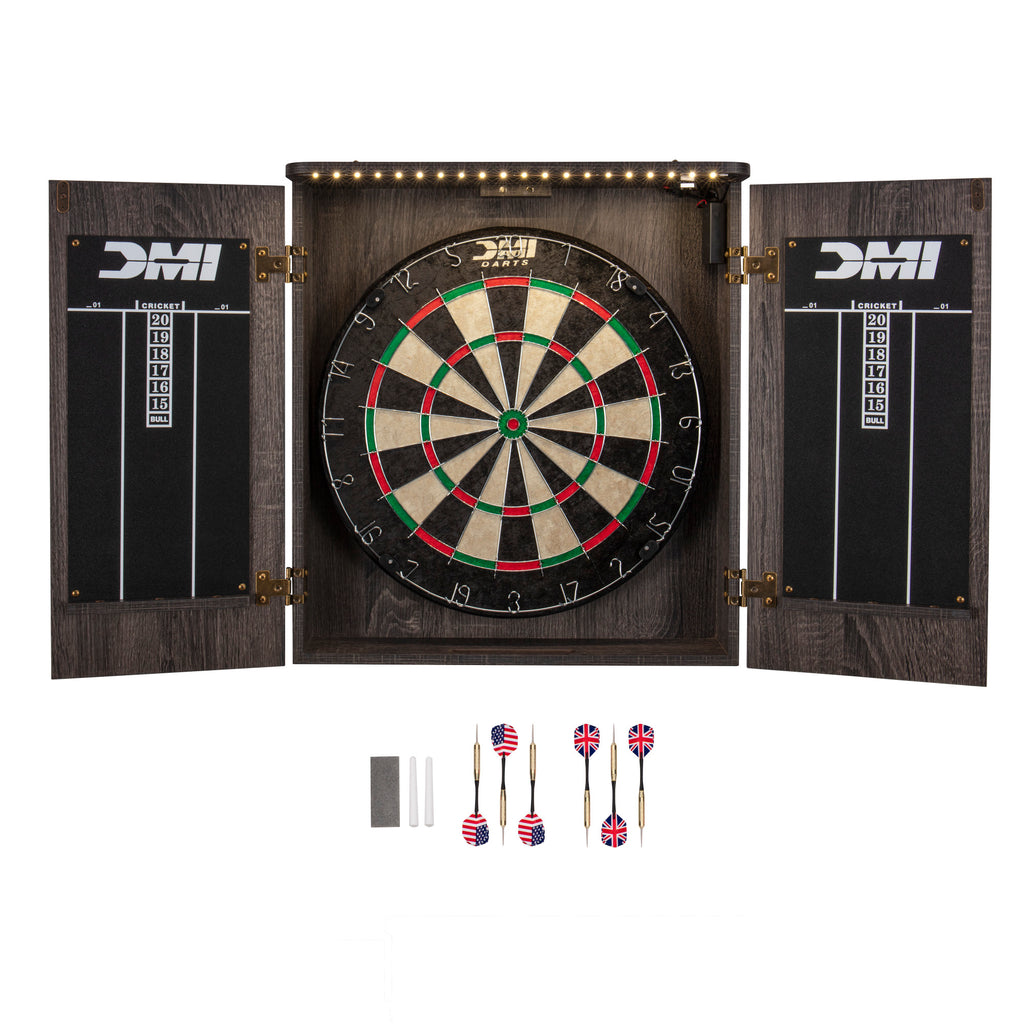 The Paris “cabinet of lights” features a unique built in LED lighting system that automatically turns on when you open the doors and shuts off when you close the cabinet doors. The top mounted LED light system is a nice finishing touch for game play in dim lighting that resembles authentic pub style play. The cabinet is finished off with a burnt grey wood laminate that will fit right in with today’s homes décor. The included dartboard is an official size 18” x 1.5” Bristle sisal dartboard with self-healing properties. The board includes a rotatable number ring so that the heavy traffic areas of the board can be changed to prolong the life of your dartboard. The set includes 6 steel tip darts, so the board is ready to play on when you get it home.