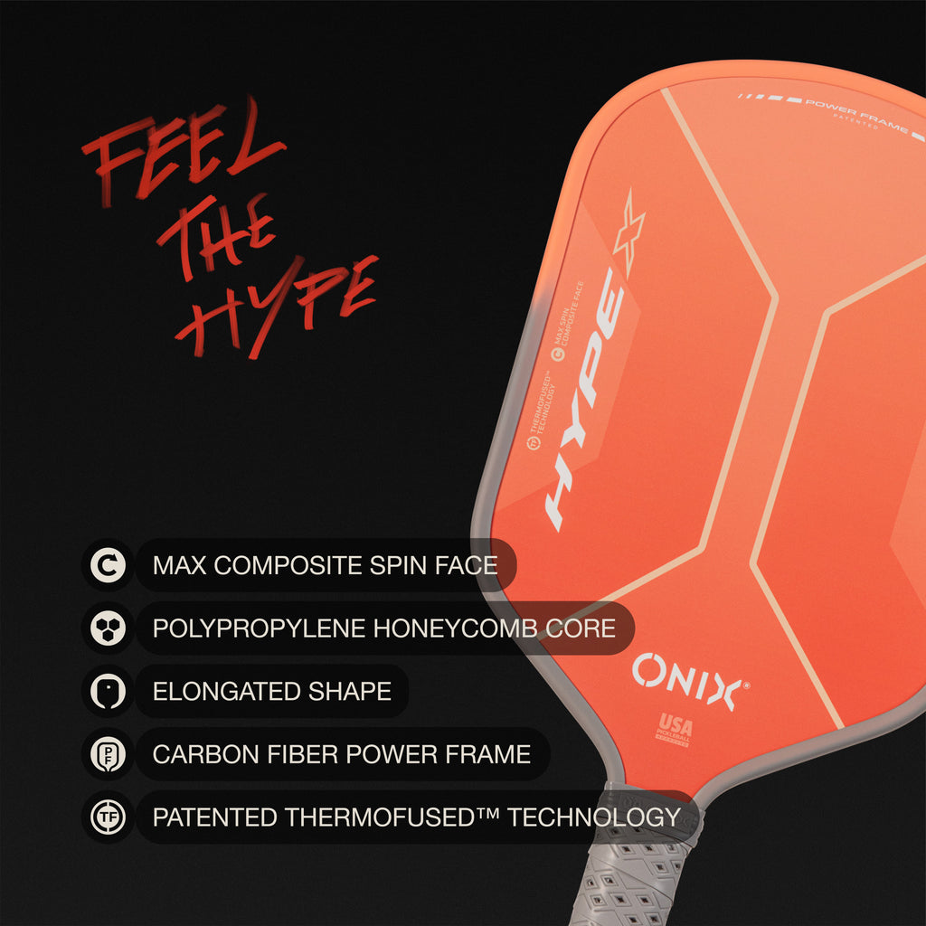 Introducing Hype X. No fads or fluff. Just tested and perfected features that make your game more dynamic (with a Max Composite Face for more spin and Honeycomb Core for more pop), more consistent (with an elongated shape for a larger sweet spot) and more fun, for longer (with a patented Carbon Fiber Power Frame with ThermoFused™ Technology for more durability). All from a brand that's been around since before the boom.